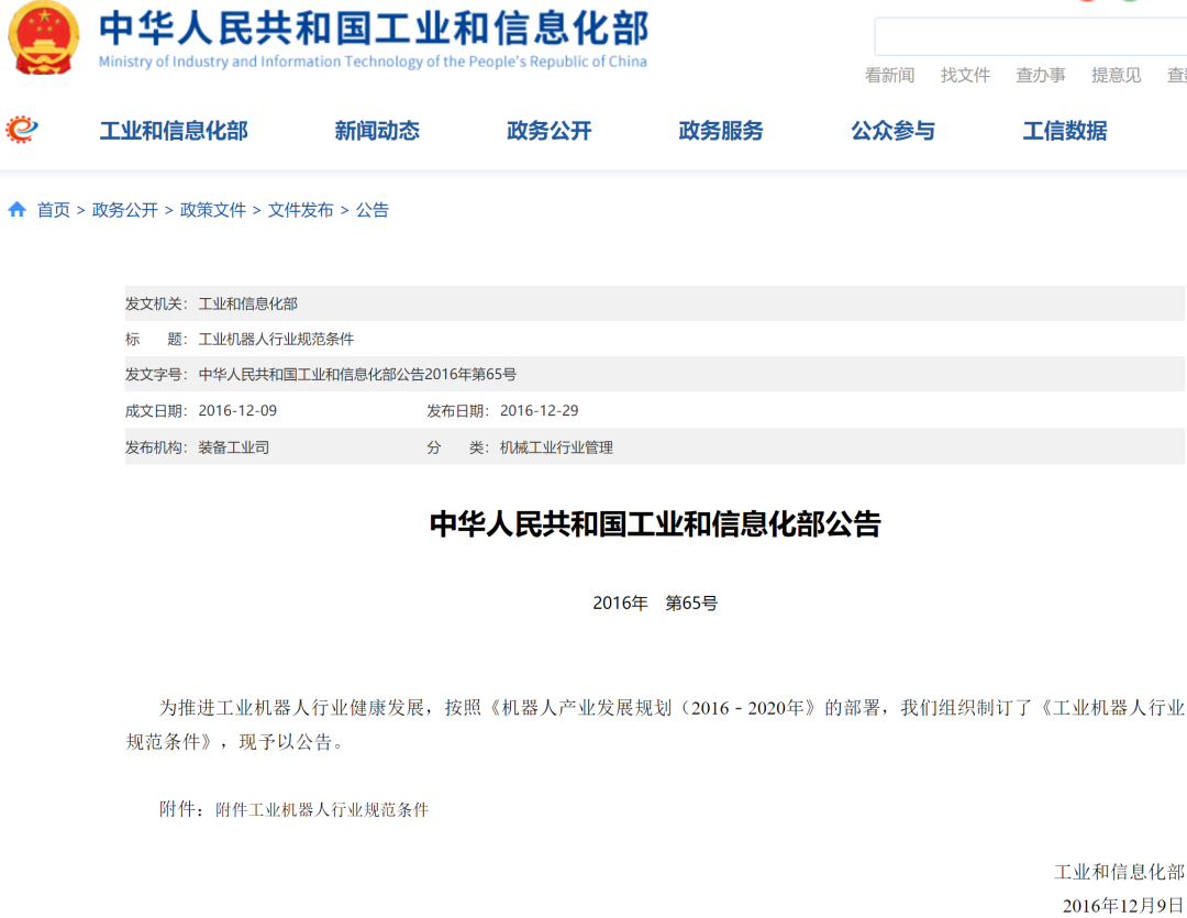 (《工业机器人行业规范条件》公告)