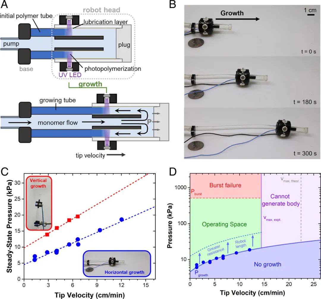 这种不断“生长”的能里使其能够执行一系列任务,包括探索、挖掘和穿越曲折的路径,这突出了合成增长作为一个平台的潜力,用于各种环境下的基础设施、勘探和传感的按需制造。