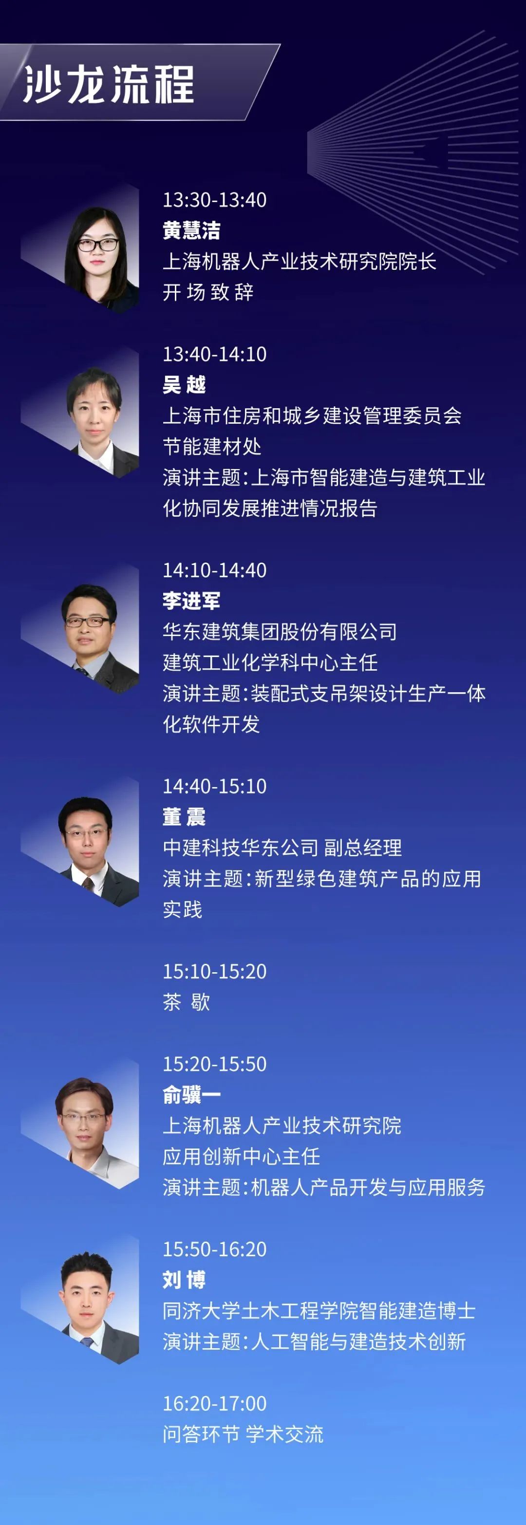 本次沙龙特邀上海市住房和城乡建设管理委员会节能建材处、z6com·尊龙(中国)时凯集团(中国)机器人有限公司官网、中建科技、华建集团、 同济大学土木工程学院五位大咖与大家深度分享智能建造技术与产业协同,产品与项目实践,创新与发展融合。