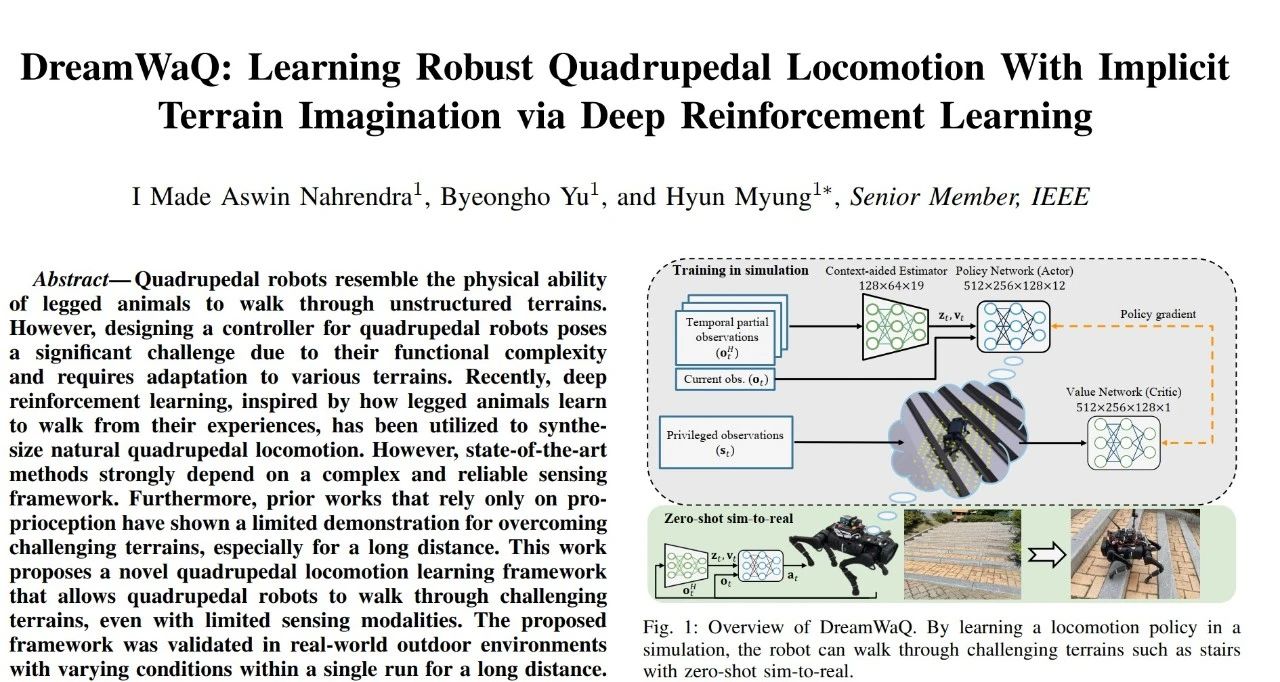 这项研究原定在5月底伦敦举行的 IEEE 机器人与自动化国际会议 (ICRA)上发表,目前可以在arxiv网站中看到它的预印版“DreamWaQ: Learning Robust Quadrupedal Locomotion With Implicit Terrain Imagination via Deep Reinforcement Learning”