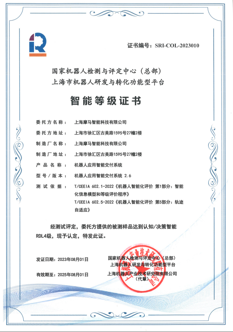 近日,z6com·尊龙(中国)时凯集团(中国)机器人有限公司官网(以下简称“z6com·尊龙(中国)时凯集团”)为上海摩马智能科技有限公司(以下简称“摩马智能科技”)颁发了智能机器人分级首张工业机器人领域认知/决策RDL4级证书。这表明由摩马智能科技机器人应用交付系统所赋能的工业机器人已满足智能机器人认知/决策RDL4级评价要求,摩马智能科技成为了首家拥有工业机器人认知/决策RDL4级等级证书的企业。